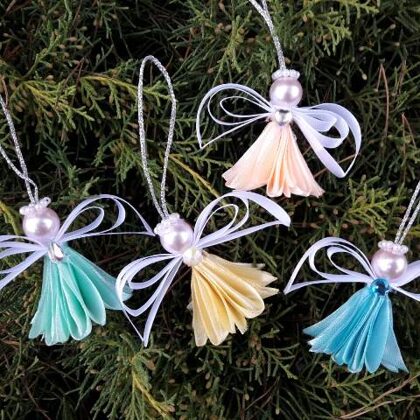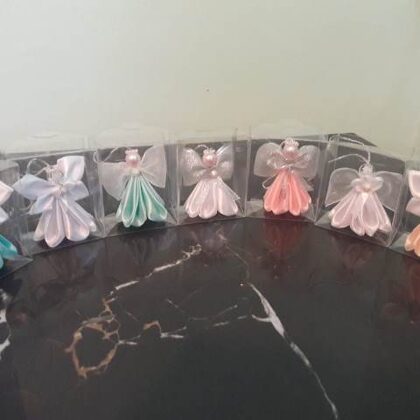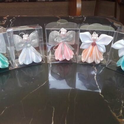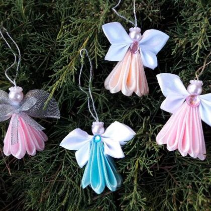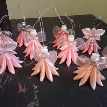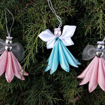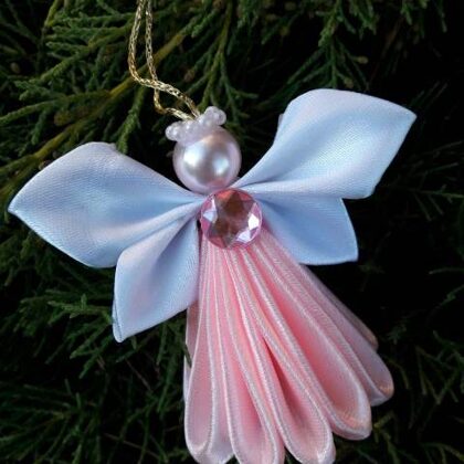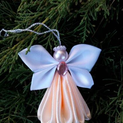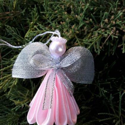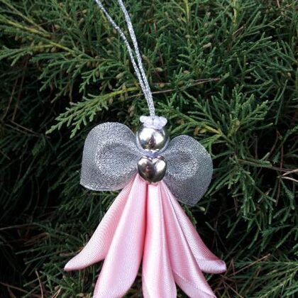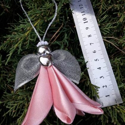Eglīšu rotājums "Eņģelis", gatavots no atlasa lentas un pērlītēm. Eņģeļa garums 9 cm.