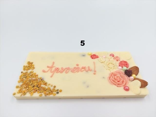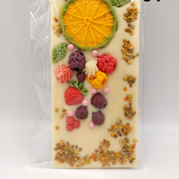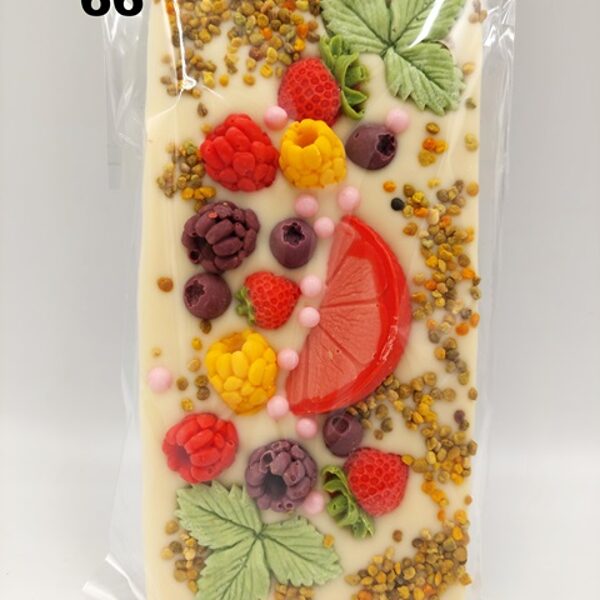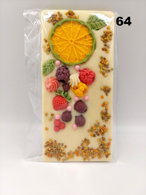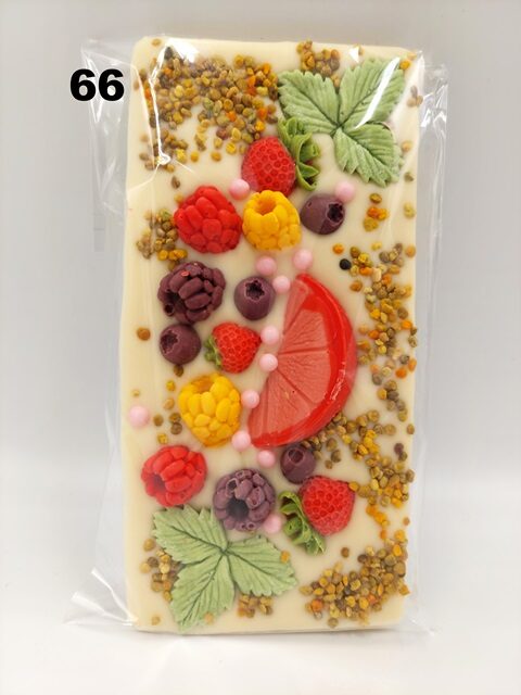 - baltā šokolāde (cukurs, kakao sviests, pilnpiena pulveris, emulgators-sojas lecitīns, dabīgs vaniļas aromatizētājs).